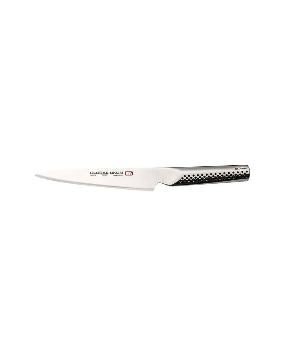 Ιδιαίτερα χαρακτηριστικά Καθαρό βάρος: 97 γρ. Μήκος λάμας: 15 εκ. Πάχος λάμας: 1.8 χιλ. Πλάτος λάμας: 3 εκ. Συνολικό μήκος: 26 εκ. Το μαχαίρι γενικής χρήσης GUS-24 της σειράς Global UKON είναι ιδανικό για τον τεμαχισμό μικρότερων τροφίμων, όπως κρεμμυδάκια, αβοκάντο και τυρί. Αυτό το πολυχρηστικό μαχαίρι μοιράζεται πολλές ιδιότητες ενός μαχαιριού σεφ, αλλά είναι κατάλληλο για να δουλεύει με μικρότερα τρόφιμα, επιτρέποντας πιο ακριβείς, λεπτές εργασίες κοπής. Το μαχαίρι γενικής χρήσης GUS-24 είναι επίσης χρήσιμο ως μικρό μαχαίρι carving. Το μαχαίρι γενικής χρήσης είναι ένα πολυλειτουργικό εργαλείο κουζίνας που γεφυρώνει το κενό μεταξύ ενός μαχαιριού αποφλοίωσης και ενός μαχαιριού σεφ. Διαθέτει συνήθως μήκος λεπίδας μεταξύ 10 και 18 εκατοστών και είναι σχεδιασμένο για εργασίες που απαιτούν μεγαλύτερη ακρίβεια από ό,τι μπορεί να προσφέρει ένα μαχαίρι σεφ, αλλά περισσότερο βάρος από ένα μαχαίρι αποφλοίωσης. Το μαχαίρι γενικής χρήσης αποτελεί ένα αξιόπιστο εργαλείο για καθημερινές μαγειρικές εργασίες. Είναι ιδανικό για το κόψιμο φρούτων, λαχανικών και μικρών κομματιών κρέατος, προσφέροντας ακρίβεια και ευκολία στη χρήση.