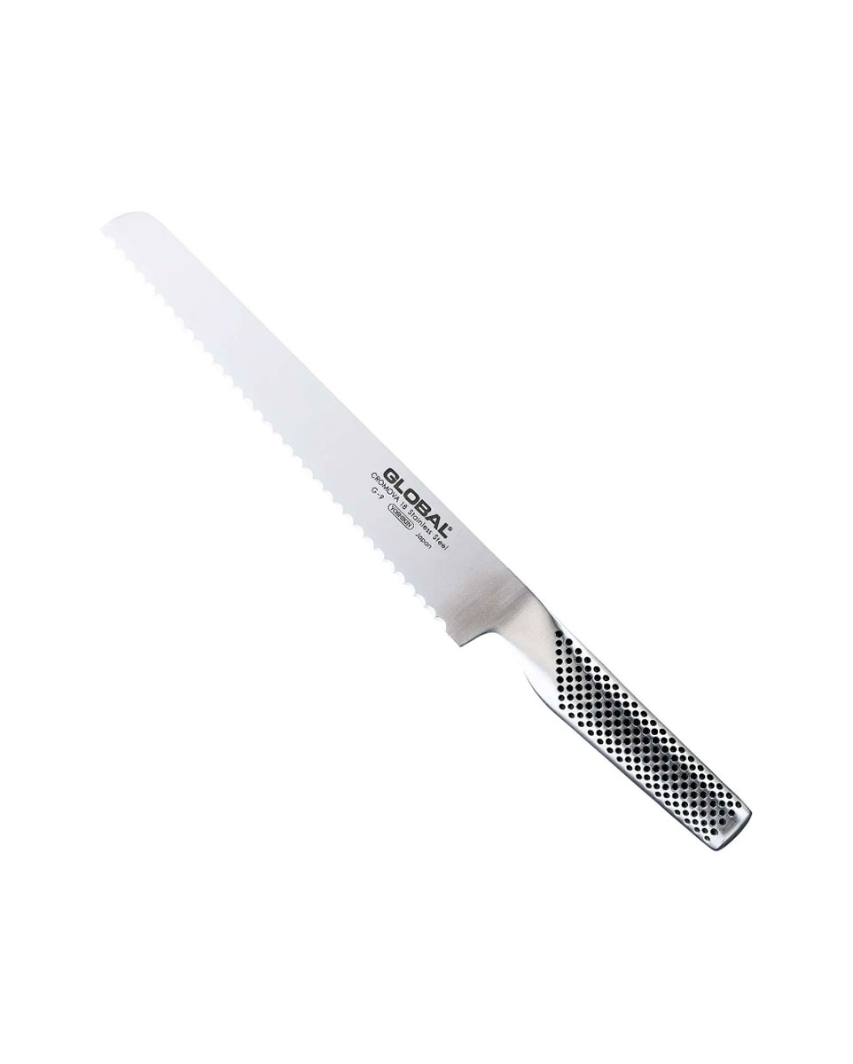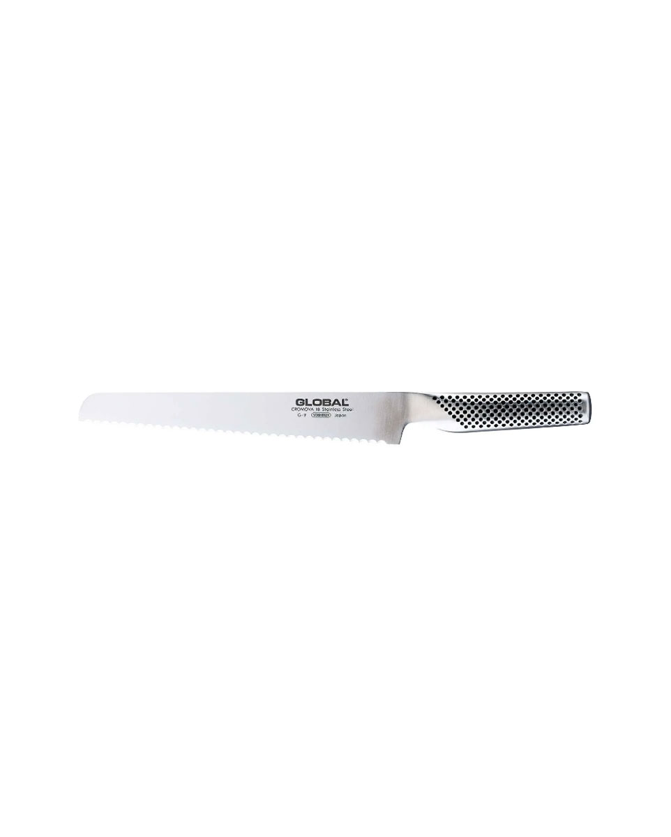 Ιδιαίτερα χαρακτηριστικά Καθαρό βάρος: 160 γρ. Σκληρότητα Rockwell: C56-58 Μήκος λάμας: 22 εκ. Πάχος λάμας: 1.9 χιλ. Πλάτος λάμας: 3.5 εκ. Συνολικό μήκος: 34.5 εκ. Το G-9 αποτελεί το κλασικό μαχαίρι ψωμιού της Global. Πρόκειται για ένα εξειδικευμένο μαχαίρι, για χρήση μόνο με ψωμί ή παρόμοια τρόφιμα. Οι οδοντώσεις του είναι φτιαγμένες για να πριονίζουν την κρούστα του ψωμιού, αλλά θα μπορούσε επίσης να χρησιμοποιηθεί για κάποια σκληρά κρέατα. Το μαχαίρι ψωμιού είναι ένα ειδικά σχεδιασμένο εργαλείο κουζίνας που χρησιμοποιείται για την κοπή ψωμιού και άλλων αρτοσκευασμάτων. Το κύριο γνώρισμα του είναι η μακριά, οδοντωτή λεπίδα του, που επιτρέπει στο μαχαίρι να κόβει εύκολα μέσω της σκληρής κόρας του ψωμιού χωρίς να συνθλίβει την απαλή ψίχα του. Ένα μαχαίρι για ψωμί είναι ένα απαραίτητο εργαλείο σε κάθε κουζίνα, επιτρέποντας την κοπή φετών ψωμιού και αρτοσκευασμάτων με ευκολία και ακρίβεια.